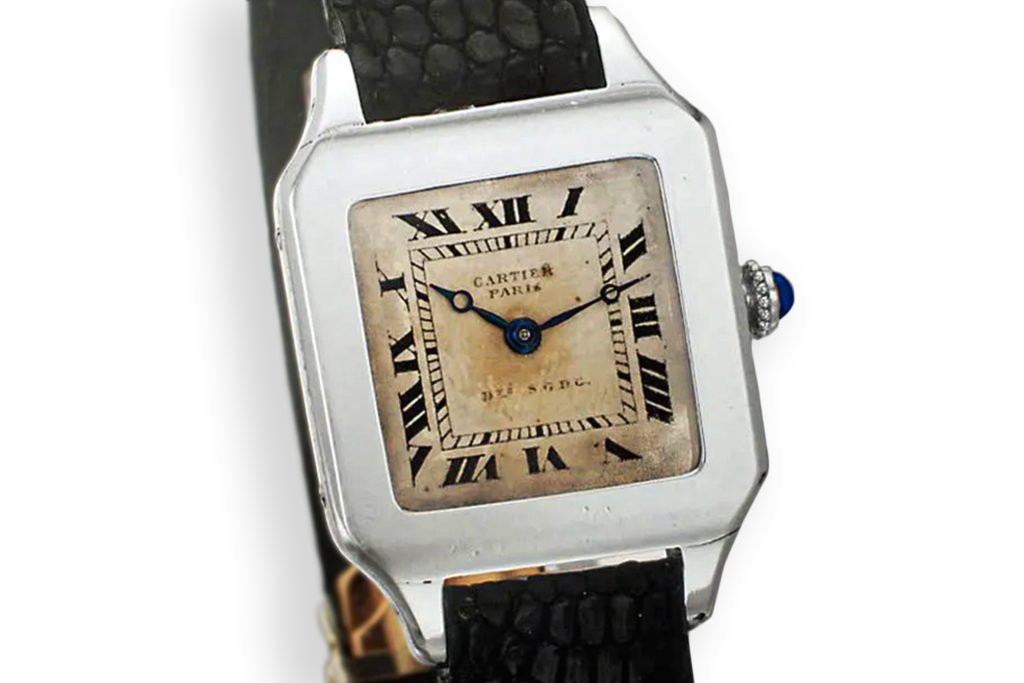 An early Santos Cartier watch; this model was available from 1911, image courtesy of https://swisswatches-magazine.com/cartier-brand-portrait-a-tale-of-watchmaking-in-the-cartier-empire/
